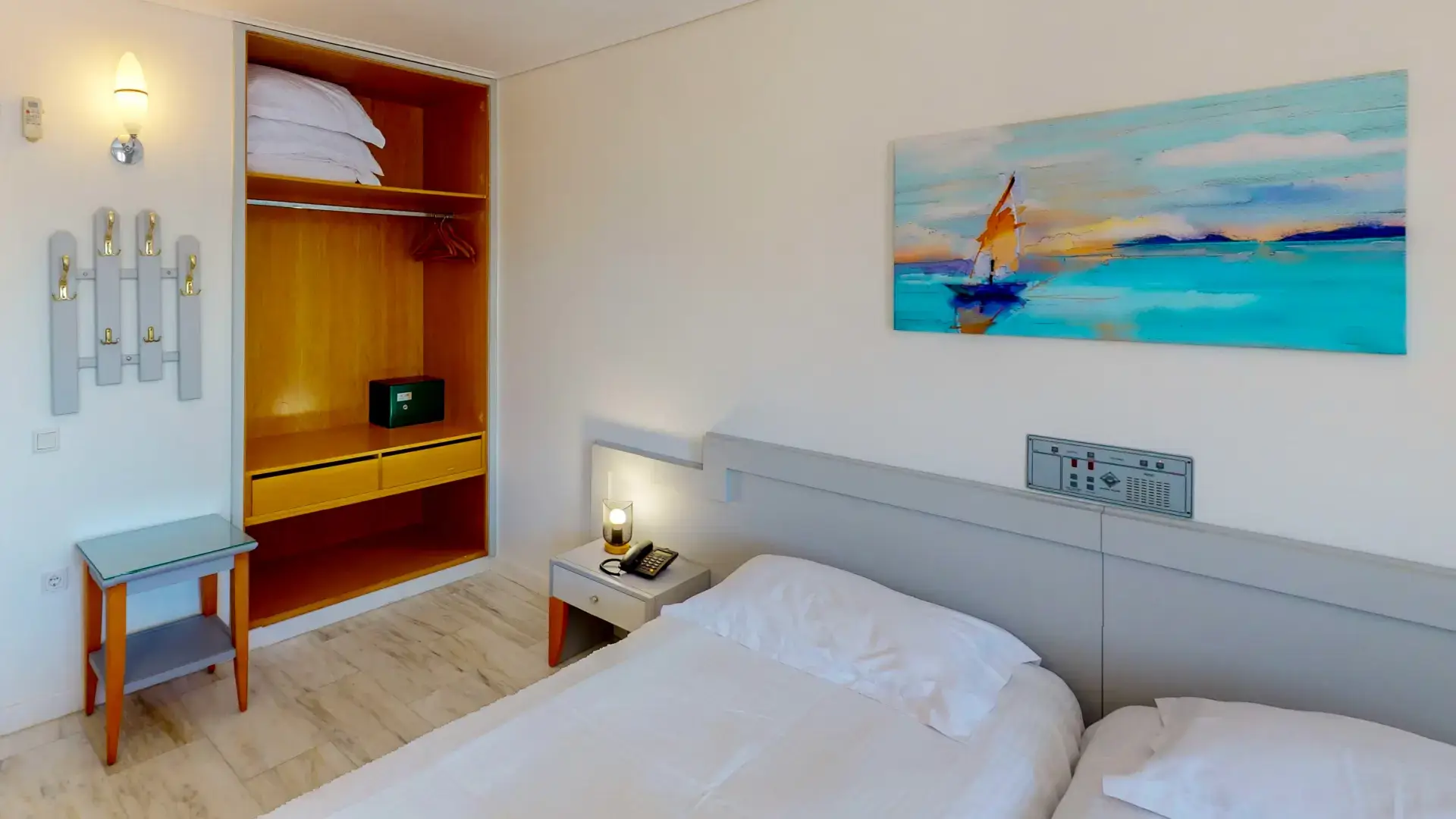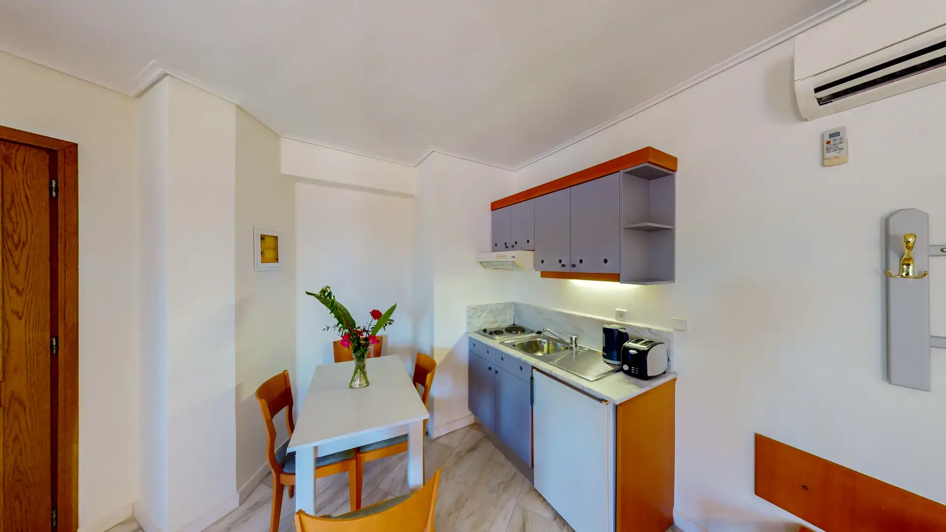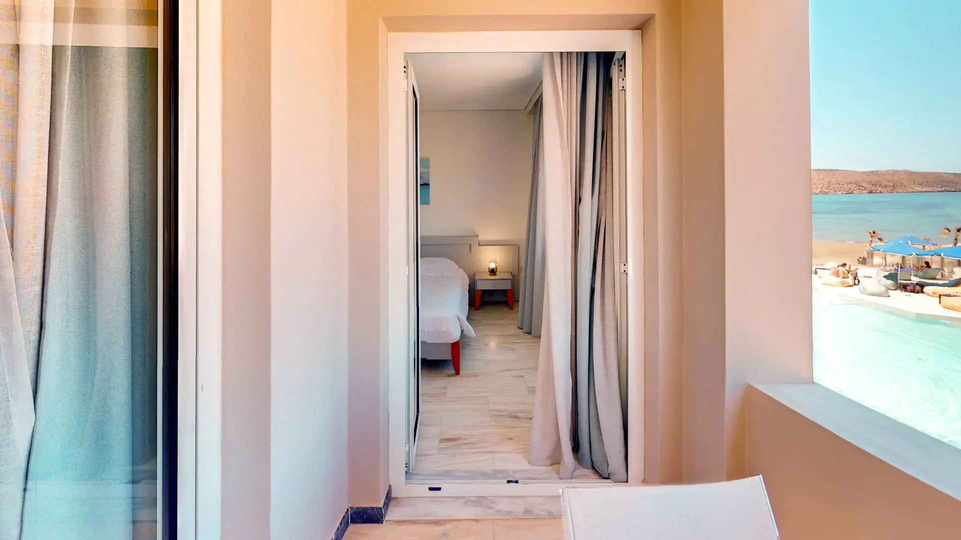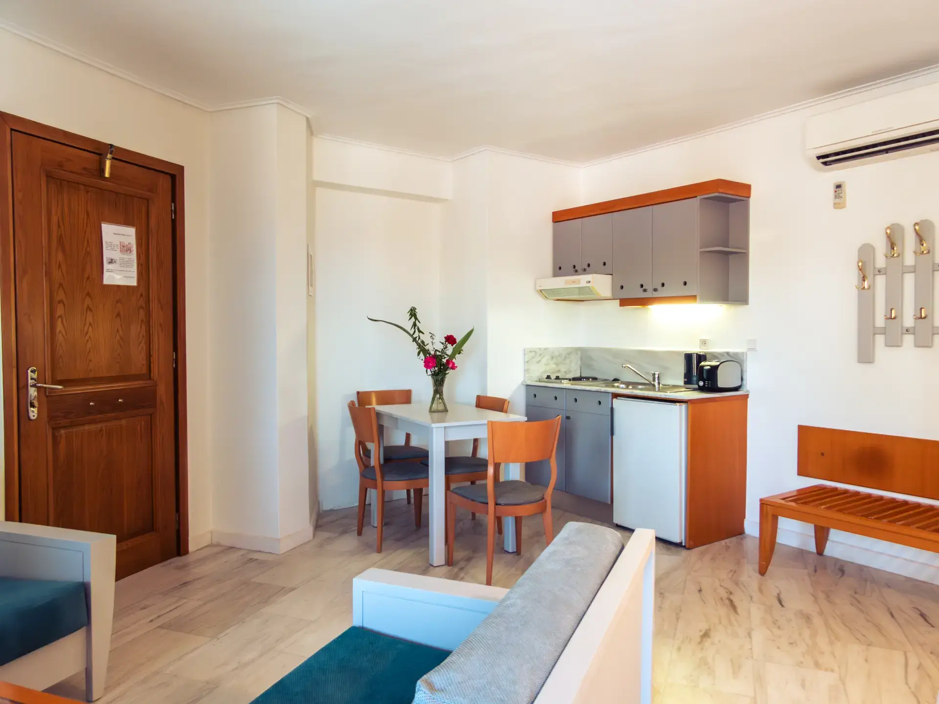 Indulge in the space and convenience of our Family Room. This one-room apartment offers the perfect blend of comfort and functionality, ideal for families or longer stays. Step out onto your private balcony or terrace and savor the breathtaking views of Agia Marina Beach, just a short stroll away.